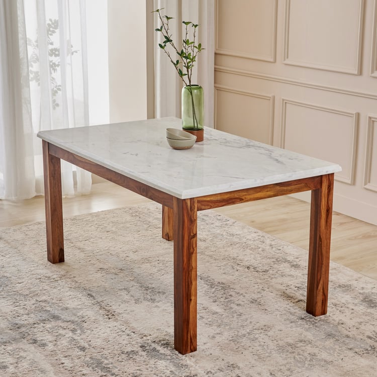 Experience a cozy gathering around this four-person dining table. Constructed from robust mango wood, this table ensures both durability and stability, thanks to its kiln-dried and chemically treated design. The legs are crafted from laminated wooden panels, providing additional strength and support. The composite marble surface serves as an engineered substitute for natural marble, combining marble chips and resin to achieve an elegant marble-like look. This composite material is less porous and highly durable, offering low maintenance requirements along with resistance to scratches and stains.