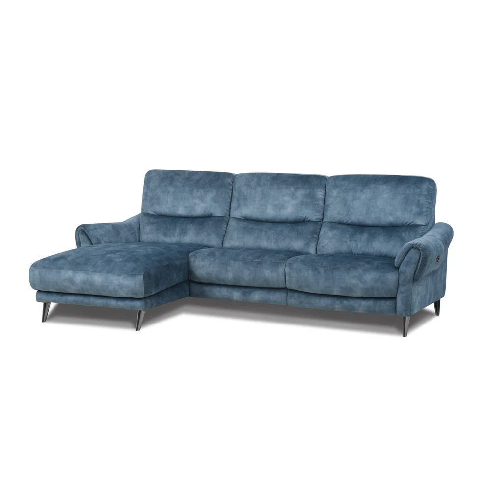 L-shaped, blue fabric sofa with a powered recliner. This leather sofa is available in Majolica Blue (FAB-DEC-11), a soft and long-lasting signature leather, and is ready for immediate delivery. only on the internet.