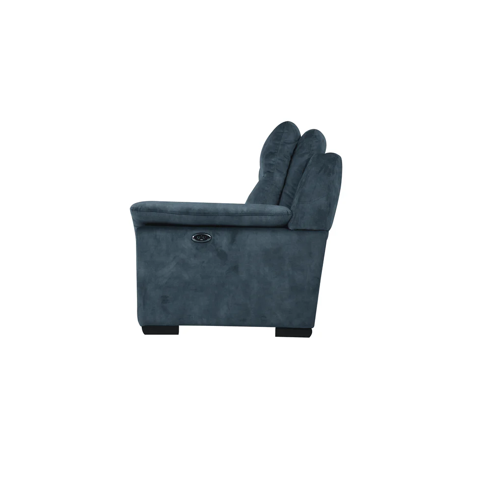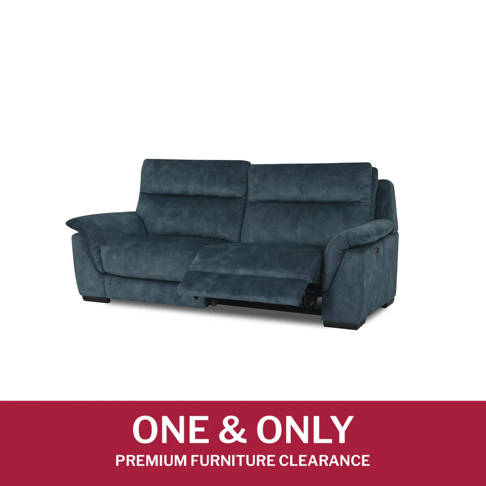 One-of-a-kind sofa 2.5-seater powered recliner that can accommodate up to three people and has a USB charging port. Only online, this ready-to-stock sofa is offered in Majolica Blue (FAB-DEC-11), a soft and lucious finish fabric.