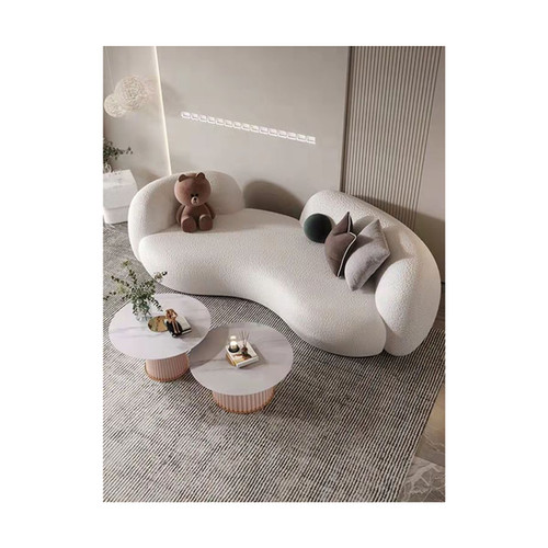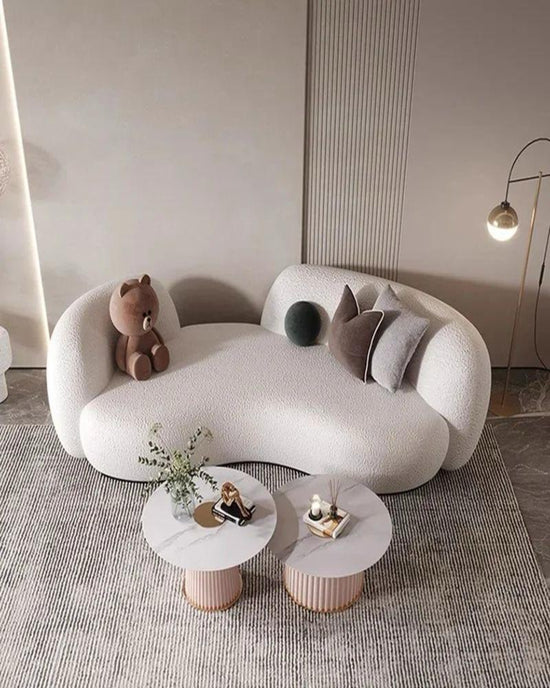 a curved, off-white boucle sofa with a modern design. It has a single, continuous seat cushion and a rounded, high back that curves around one side.
