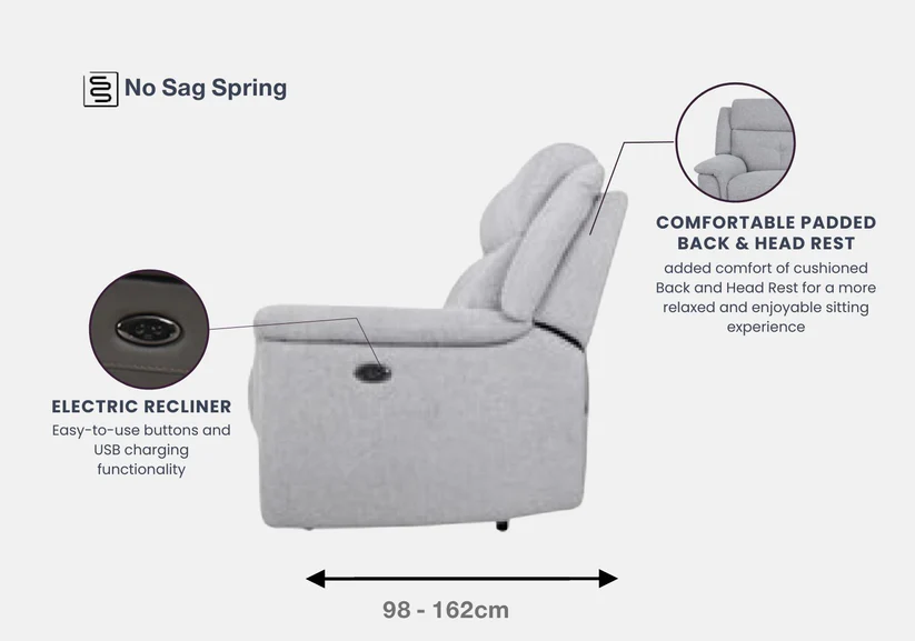 The recliner sofa offers outstanding comfort and support, featuring slim padded armrests, an electric reclining mechanism with USB charging capabilities, specialized lumbar support, and a high back design, all contributing to a lavish seating experience.